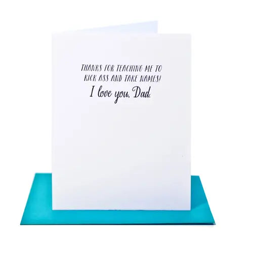 Our "kick ass and take names" dad card is letterpressed by hand on an antique press. It is printed with black ink on thick, brilliant white 100% tree-free cotton paper. It is paired with a peacock blue envelope.