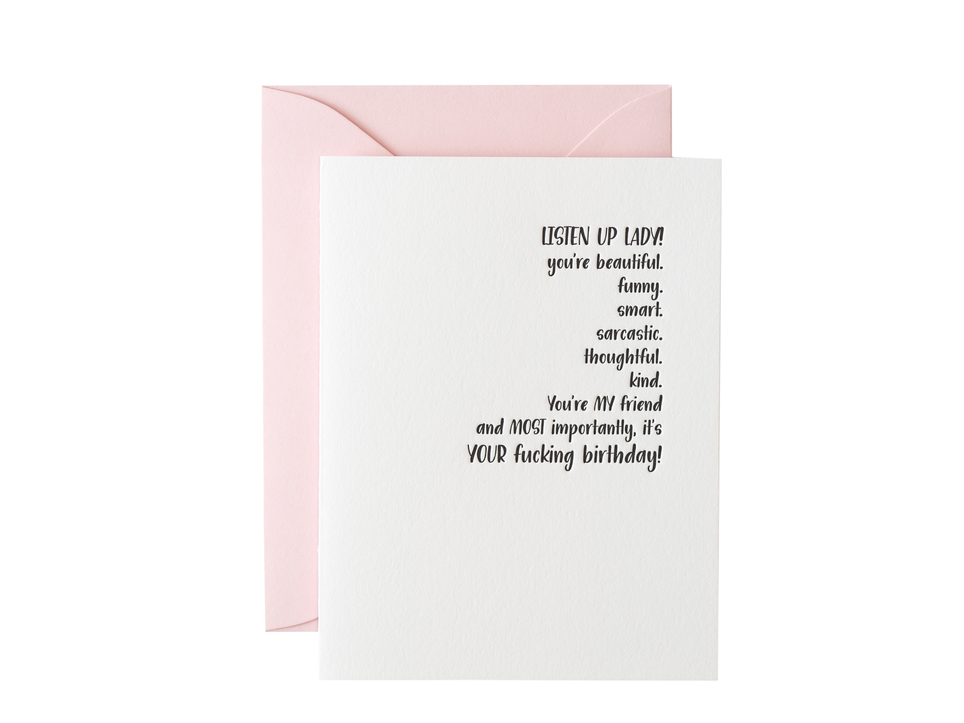 Greeting: Listen up lady! You’re beautiful. Funny. Smart. Sarcastic. Thoughtful. Kind. You’re my friend, and most importantly, it’s your fucking birthday!