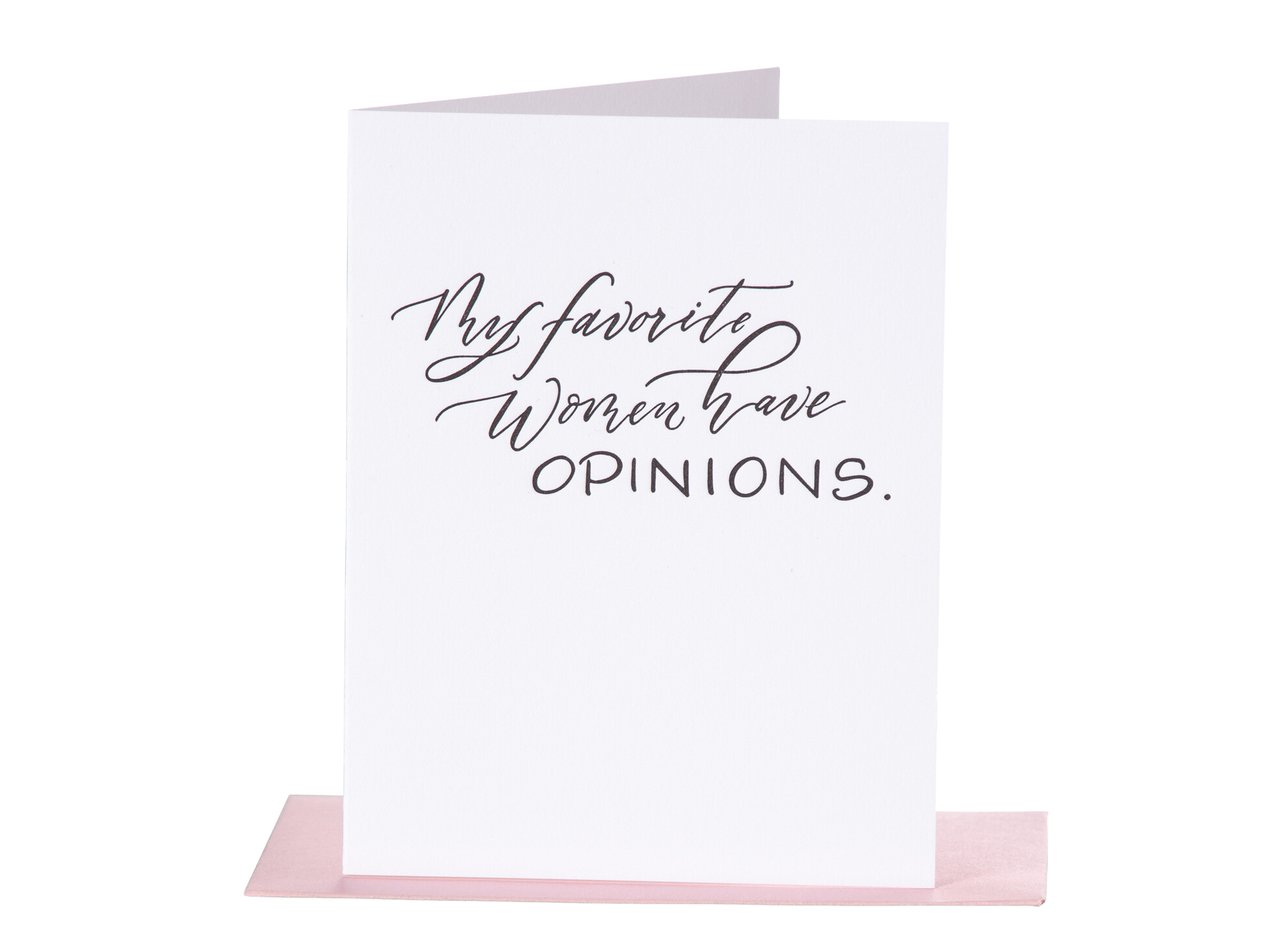 Our "My Favorite Women" greeting card is letterpressed by hand on an antique press. It is printed with black ink on thick, brilliant white 100% tree-free cotton paper. It is paired with a pale pink envelope.