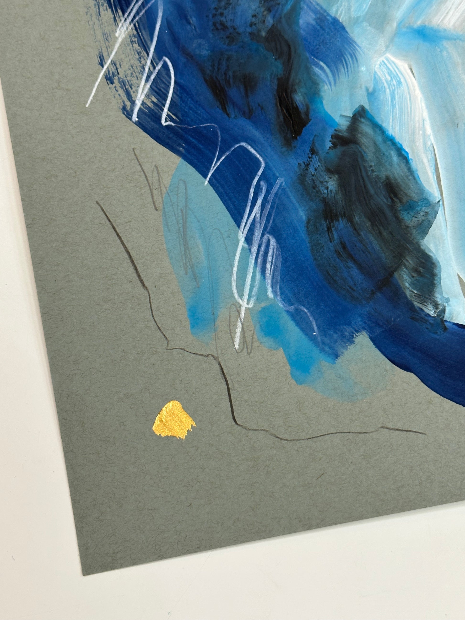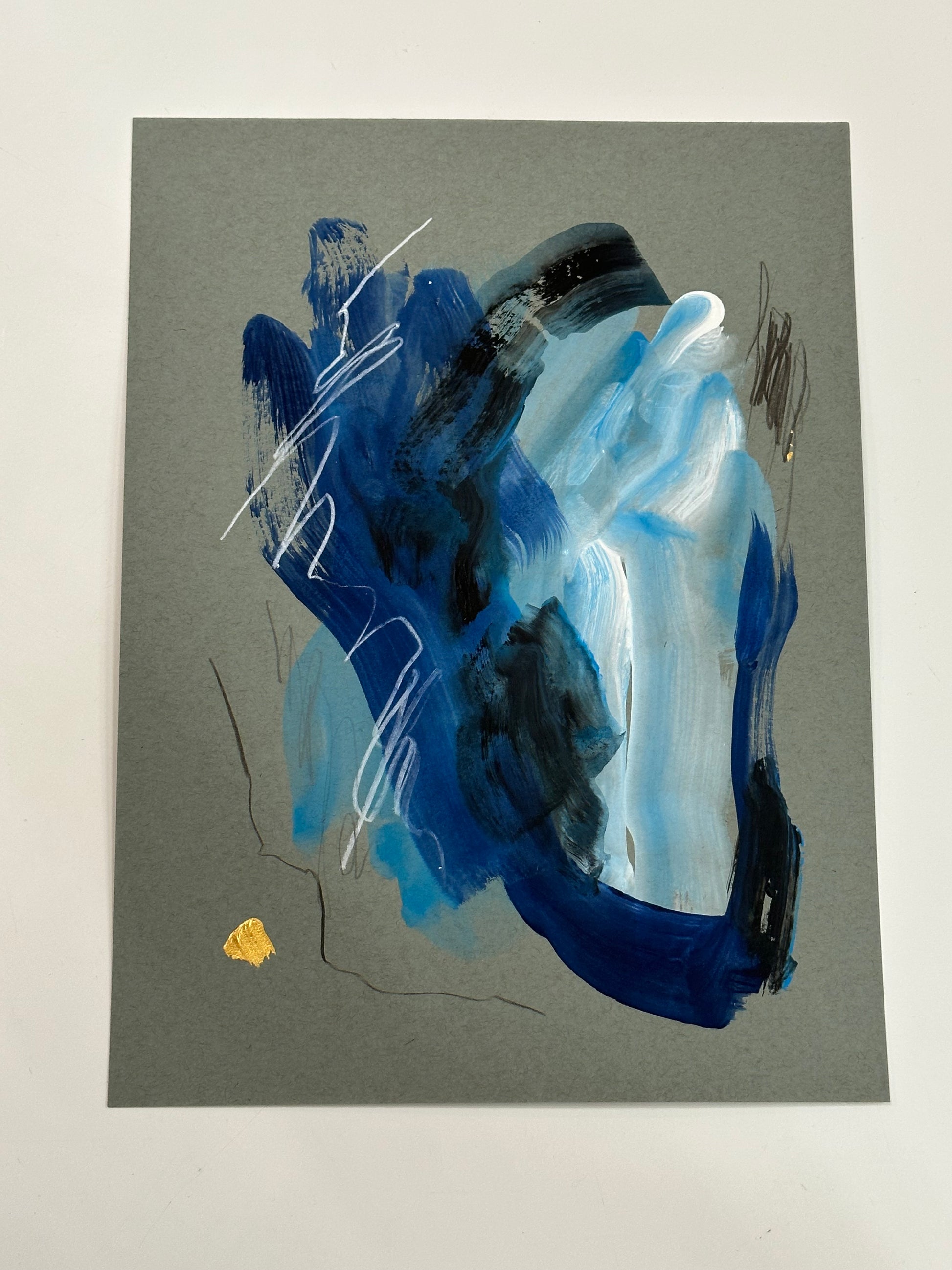 An acrylic and pencil work on gray paper, it would be a perfect candidate to frame on a gallery wall or a stand alone piece for a smaller space.